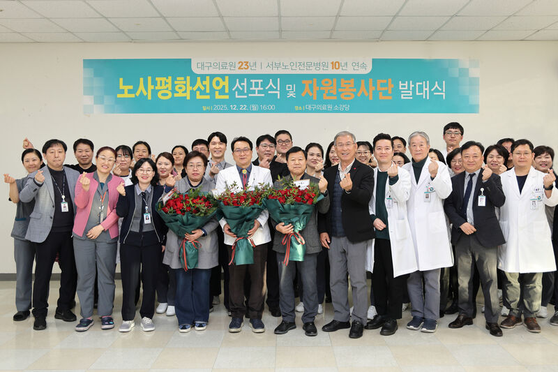 대구의료원, 23년 연속 노사평화선언 선포식 및 노사 공동 자원봉사단 발대식 개최 - 12.22.(월) 16:00, 대구의료원 소강당 - 2003년부터 23년째 무분규, 공공의료 선도를 위한 평화로운 동행 - ‘대구의료원 희망 나눔 봉사단’ 발대식 함께 열어 사회적 책임 의지 다져