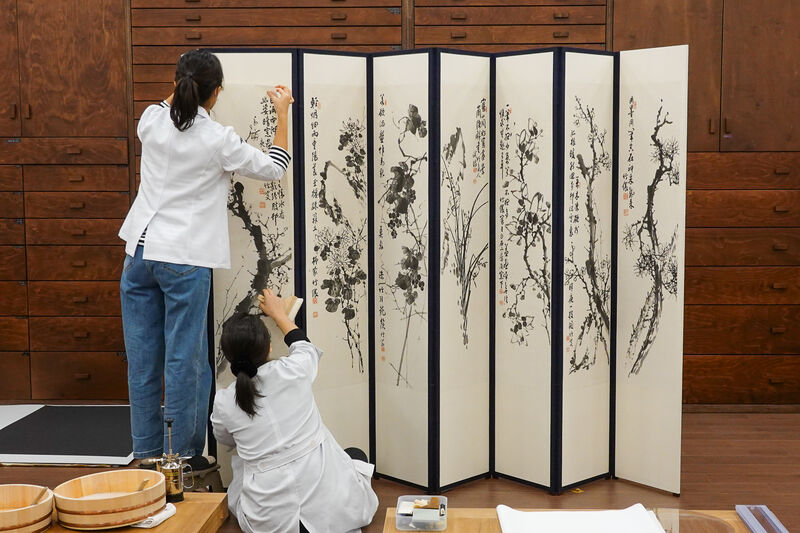 대구간송미술관 수리복원 전문 학예사가 서동균 군자화목 (대구미술관 소장)의 수리복원 과정을 진행하고 있다.  ⓒ대구간송미술관.