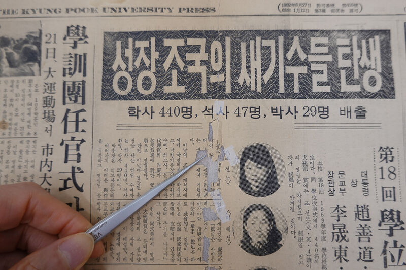 시민 참여 수리복원 공모 사업 대상인 경북대학보의 분리된 편을 맞추고 있다. 대구광역시 제공.