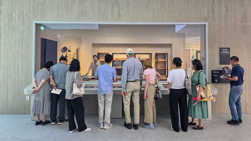 대구간송미술관을 찾은 관람객들이 ‘보이는 수리복원실’에서 수리복원 전문학예사와 질의응답하고 있다. 대구광역시 제공.