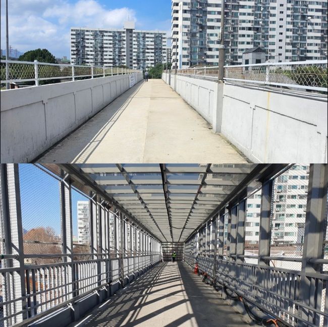 광운대역 육교 캐노피 보강공사 전후 비교사진.30일 서울 노원구(구청장 오승록)는 월계동 광운대역 일대 보행 안전을 강화하기 위해 추진해 온 광운대역 육교 캐노피 보강공사를 완료했다고 밝혔다. 대상지는 월계동 922번지 일원으로, 1989년 준공 이후 장기간 사용으로 노후화가 진행되며 구조 안전과 보행 불편 문제가 지속적으로 제기돼 왔다.