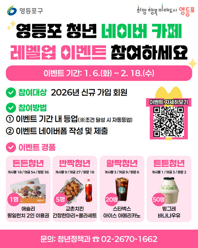 영등포 청년 네이버 카페 레벨업 이벤트 홍보 포스터.13일 영등포구(구청장 최호권)는 지역 청년들의 온라인 소통과 커뮤니티 참여를 확대하기 위해 ‘영등포 청년 네이버 카페 회원 레벨업 이벤트’를 진행한다고 밝혔다.