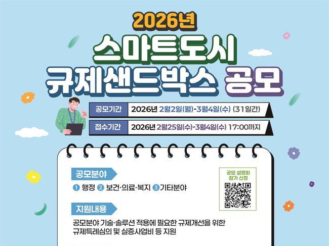 이번 공모는 지난해에 이어 추진되는 사업으로, 국민 체감도가 높은 혁신 기술·서비스의 현장 실증을 목표로 한다. 공모 대상은 행정, 보건·의료·복지, 기타 분야이며, 접수는 2월 25일부터 3월 4일까지 진행된다. 도시 문제 해결에 다양한 기술을 접목할 수 있는 스마트도시 규제샌드박스의 특성을 살려, 주거·시설, 교통, 에너지·환경 등 전반에 걸친 기술도 기타 분야로 신청할 수 있다.