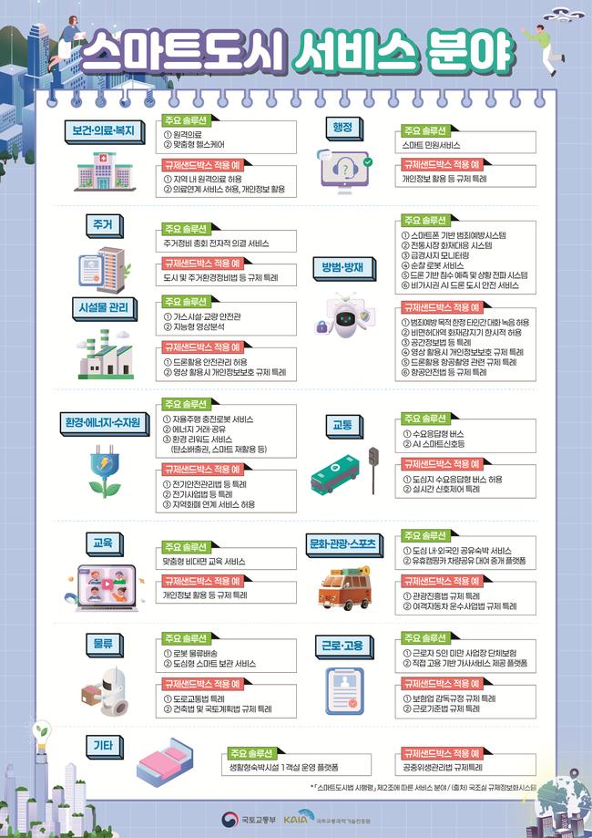 국토교통부는 스마트도시 기술·서비스의 규제 완화와 해소를 지원하기 위해 2일부터 행정, 보건·의료·복지 분야를 중심으로 스마트도시 규제샌드박스 실증사업 공모를 시작한다고 밝혔다.