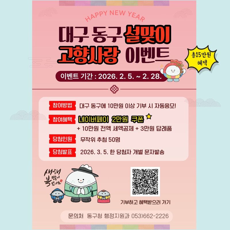 대구 동구청(구청장 윤석준)은 설 명절을 맞아 고향사랑기부제 활성화를 위한 이벤트를 28일까지 진행한다.