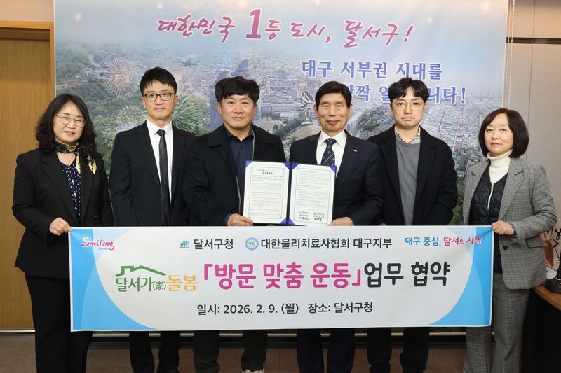 대구 달서구(구청장 이태훈)는 지난 9일, 지역사회 통합돌봄 본사업 시행을 앞두고 대한물리치료사협회 대구지부(지부장 장권욱)와 업무협약을 체결하고, ‘달서형 통합돌봄’에 방문 맞춤운동 서비스를 새롭게 도입한다.